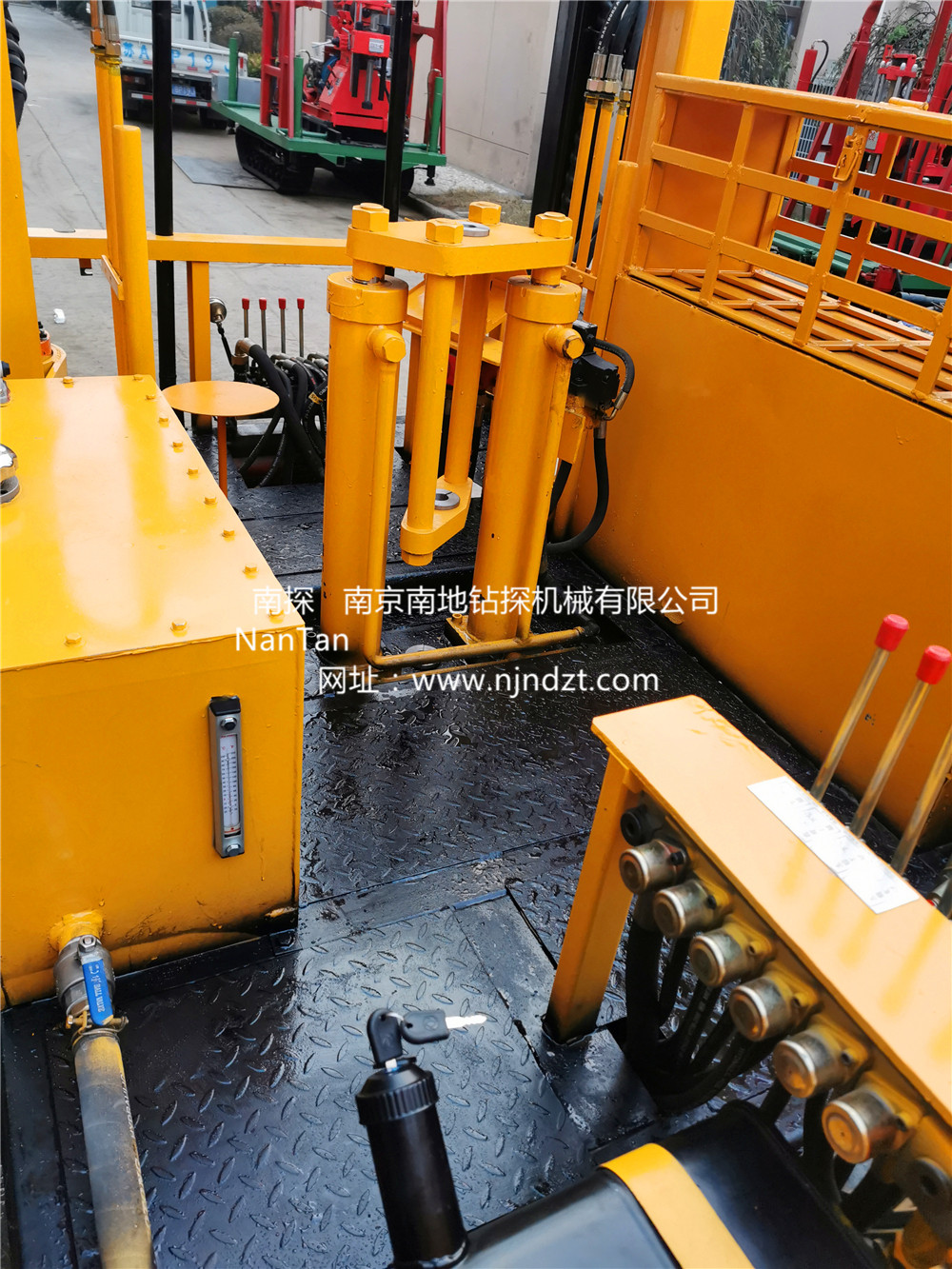 NTLPSY-L8-20T-SG型履帶靜力觸探車由自行走履帶底盤、1臺四缸柴油機、20T液壓靜探機、自動伸縮式升高型上下車液壓支撐腿系統、2組液壓下錨機、控制器、平臺及駕駛機構等組成,共同組裝在一個機架上。